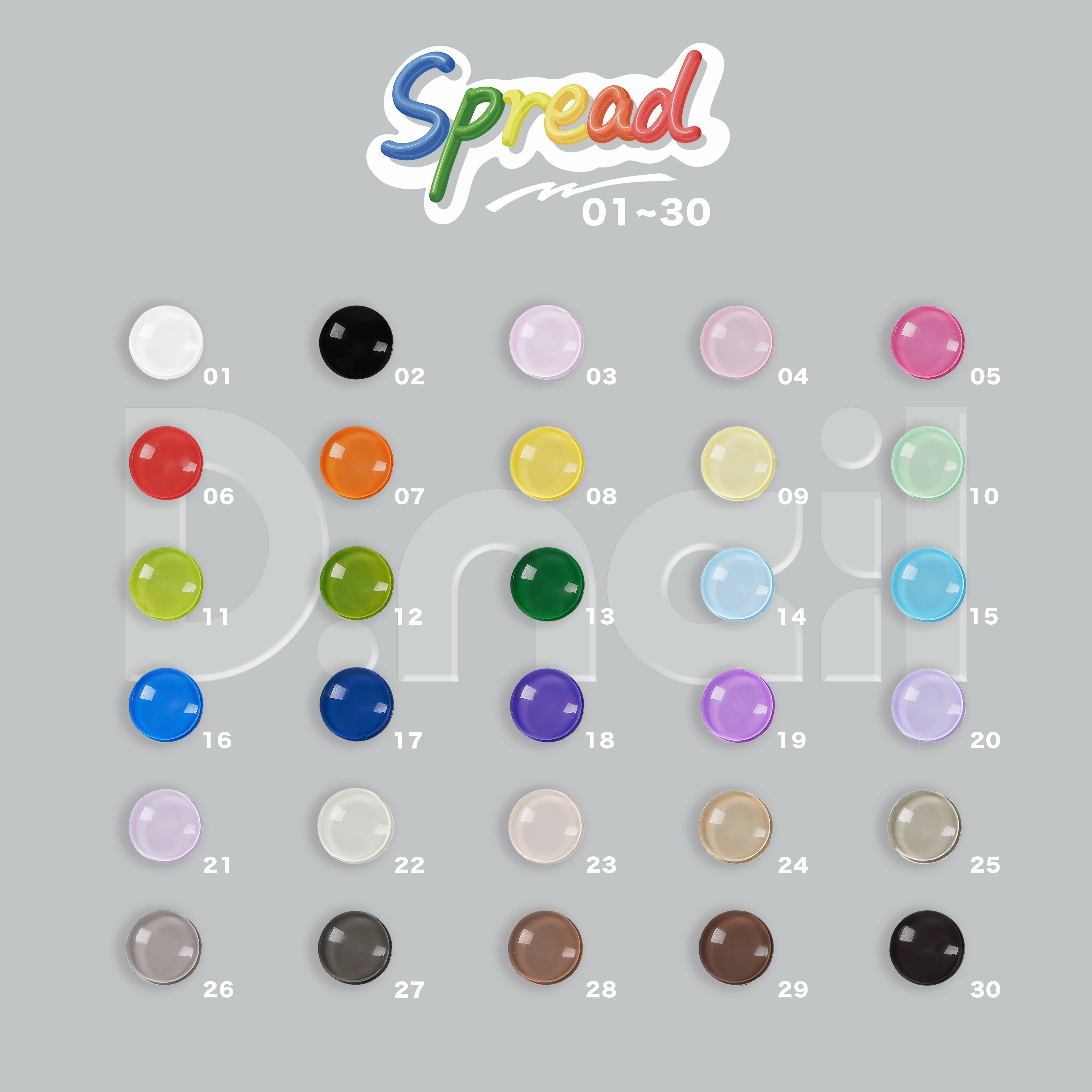 先塗刷一層慣用底膠照燈後,再薄塗專用底膠(Spread Base Gel),並照燈固化30秒。(根據底膠的硬化時間,色膠的擴散效果會有所不同)若充分固化,戳戳色膠擴散會越快。 ※如果想要將顏色塗滿全甲面,但邊緣可能因擴散而導致形狀不完整,所以請避免將底膠塗到甲面邊緣! 但若將指甲邊緣做拋磨處理,可有效減少擴散情況。
